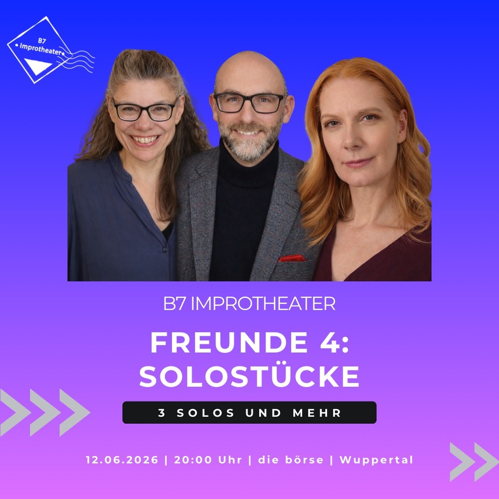 Am Freitag, den 12. Juni 2026, lädt das B7 Improtheater aus Wuppertal zu einem besonderen Theaterabend in die börse Wuppertal ein: „Freunde 4 – Solostücke“.